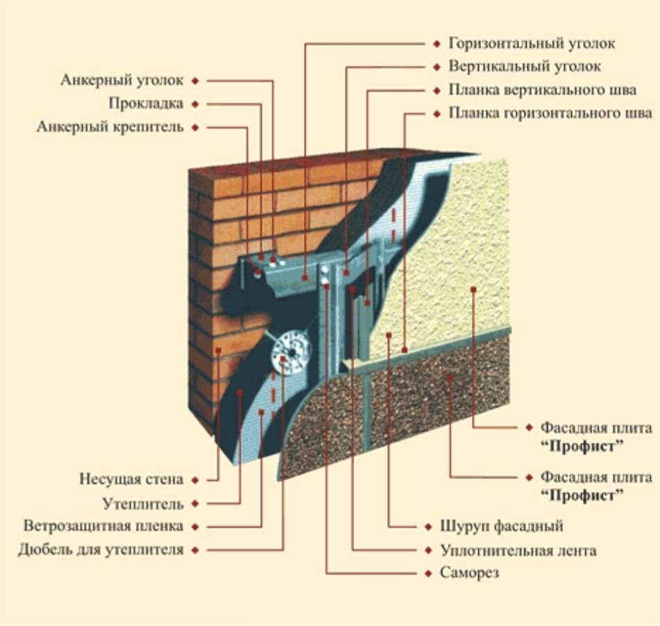 Фасадная система навесного типа представляет собой слоистую конструкцию, состоящую из:
